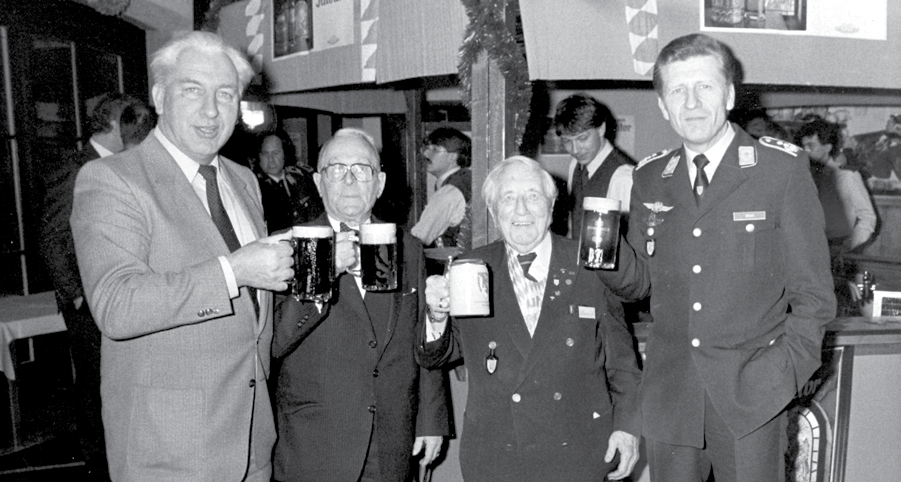 Besonderes EreignisEin besonderes Ereignis fand 1985 statt. Der Kommodore, Oberst Krah und Oberstadtdirektor Wandscher, begrüßten die beiden "Alten Adler", Dipl.Ing.Friedrich Jahn (95) und Wilhelm Hillmann (100), beide langjährige treue Gäste des Salvatorabends. |